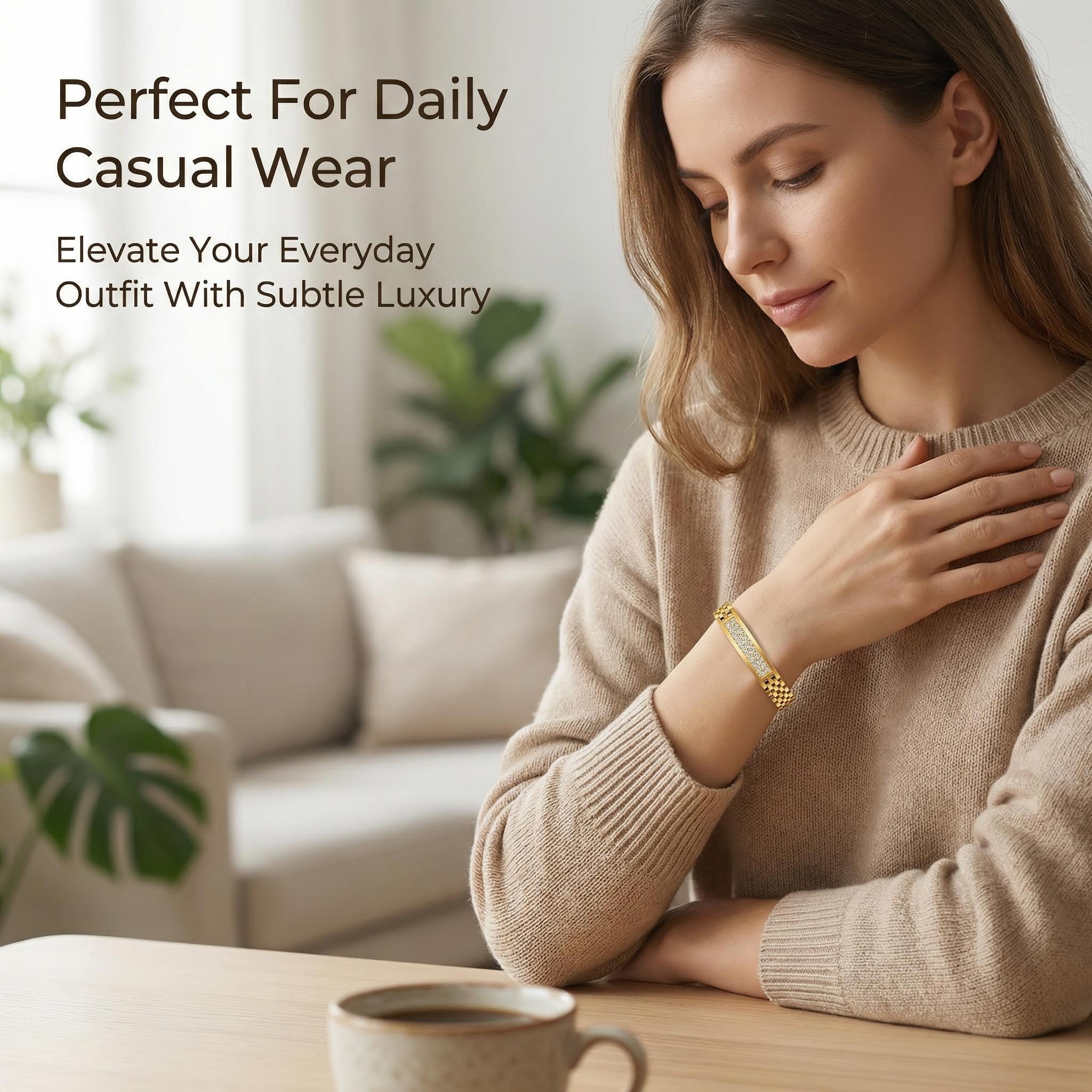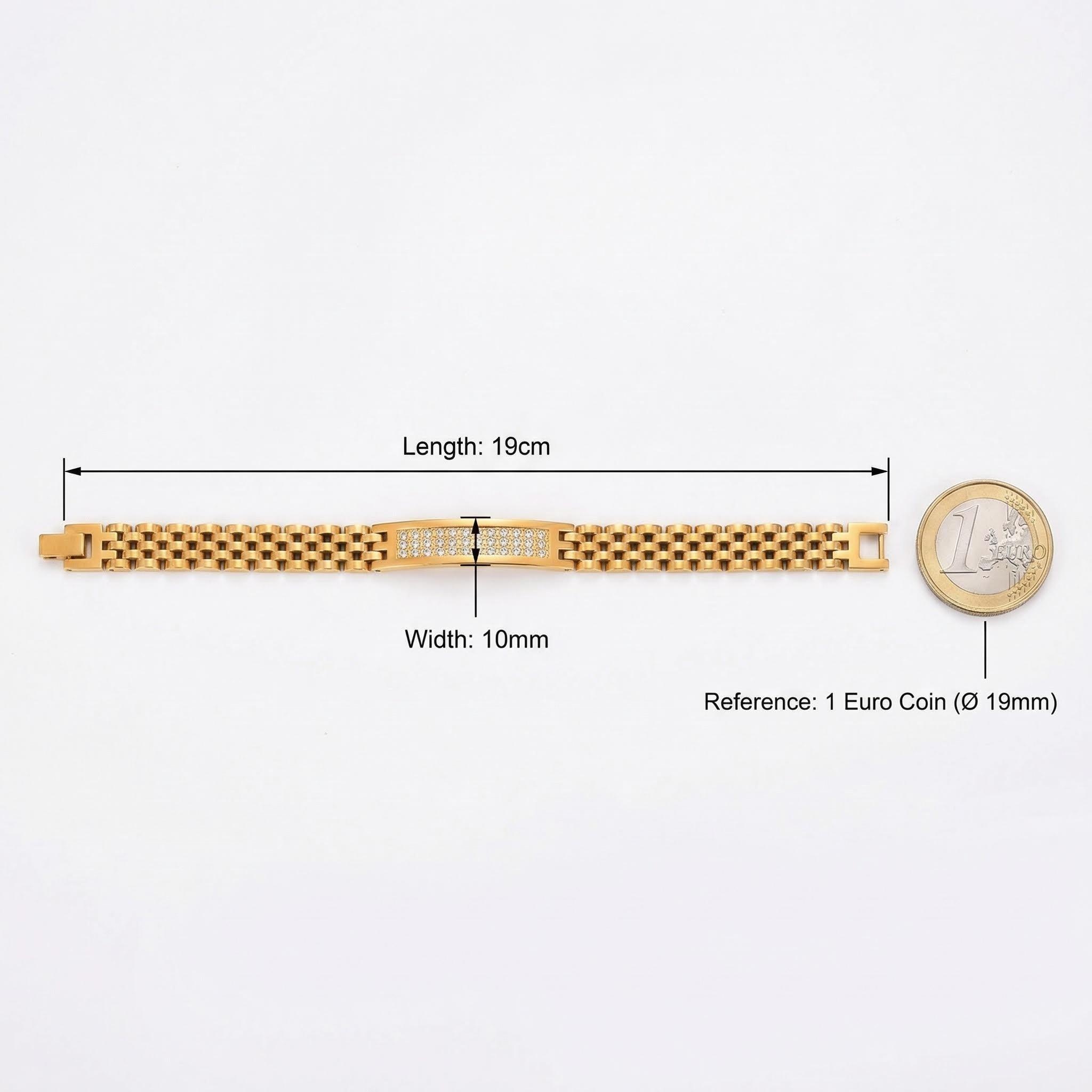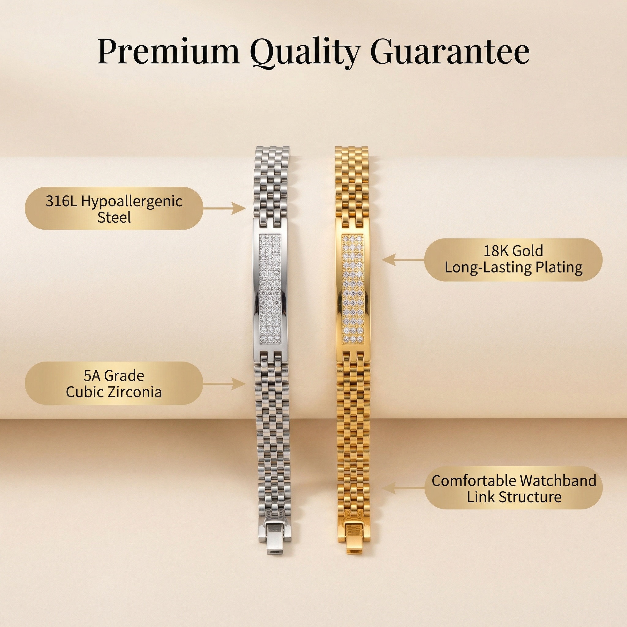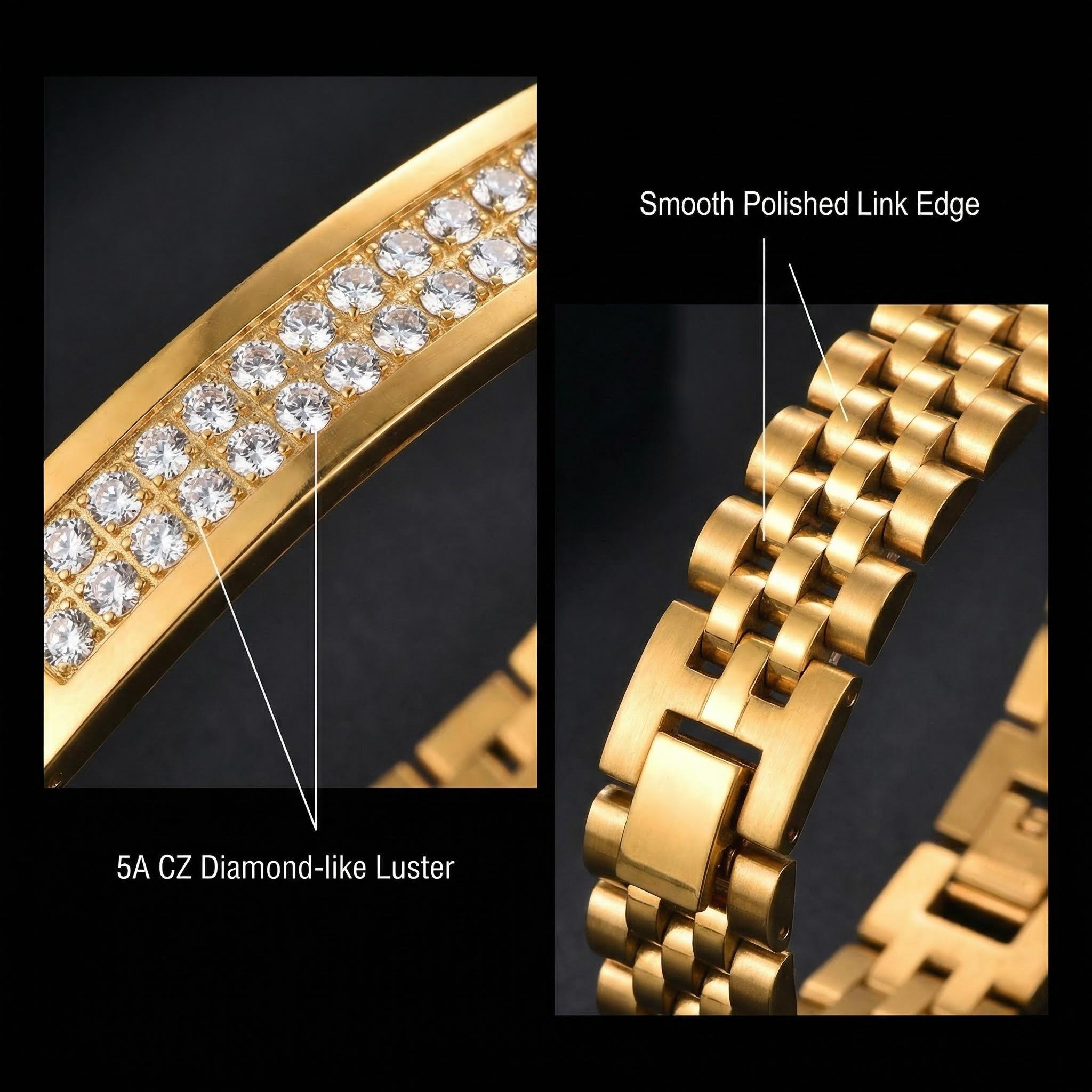 Elevate your look with our 2026 trendy stainless steel bracelet. Crafted from 316L hypoallergenic steel and finished with 18K gold plating, it features sparkling 5A cubic zirconia stones. The comfortable watchband link design and smooth edges make it perfect for formal occasions and daily wear—an elegant unisex accessory for any wardrobe.