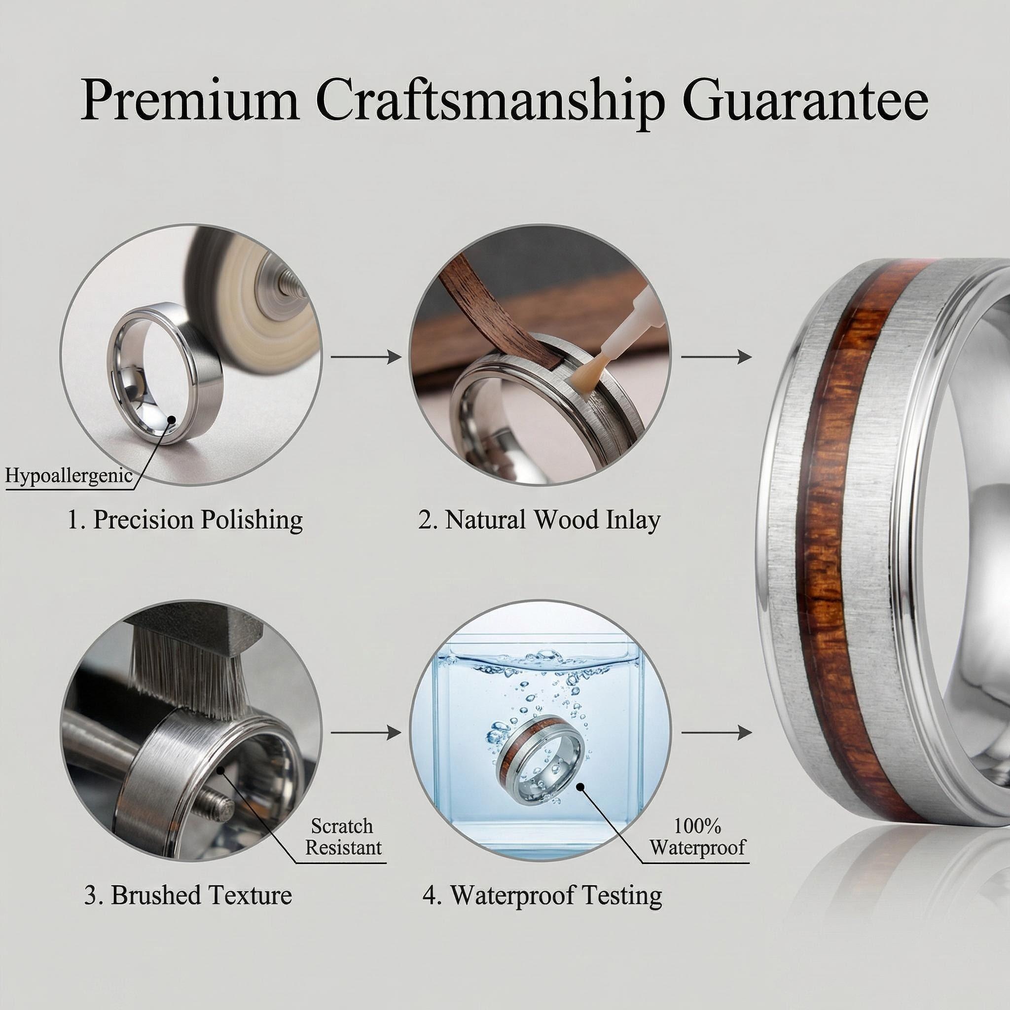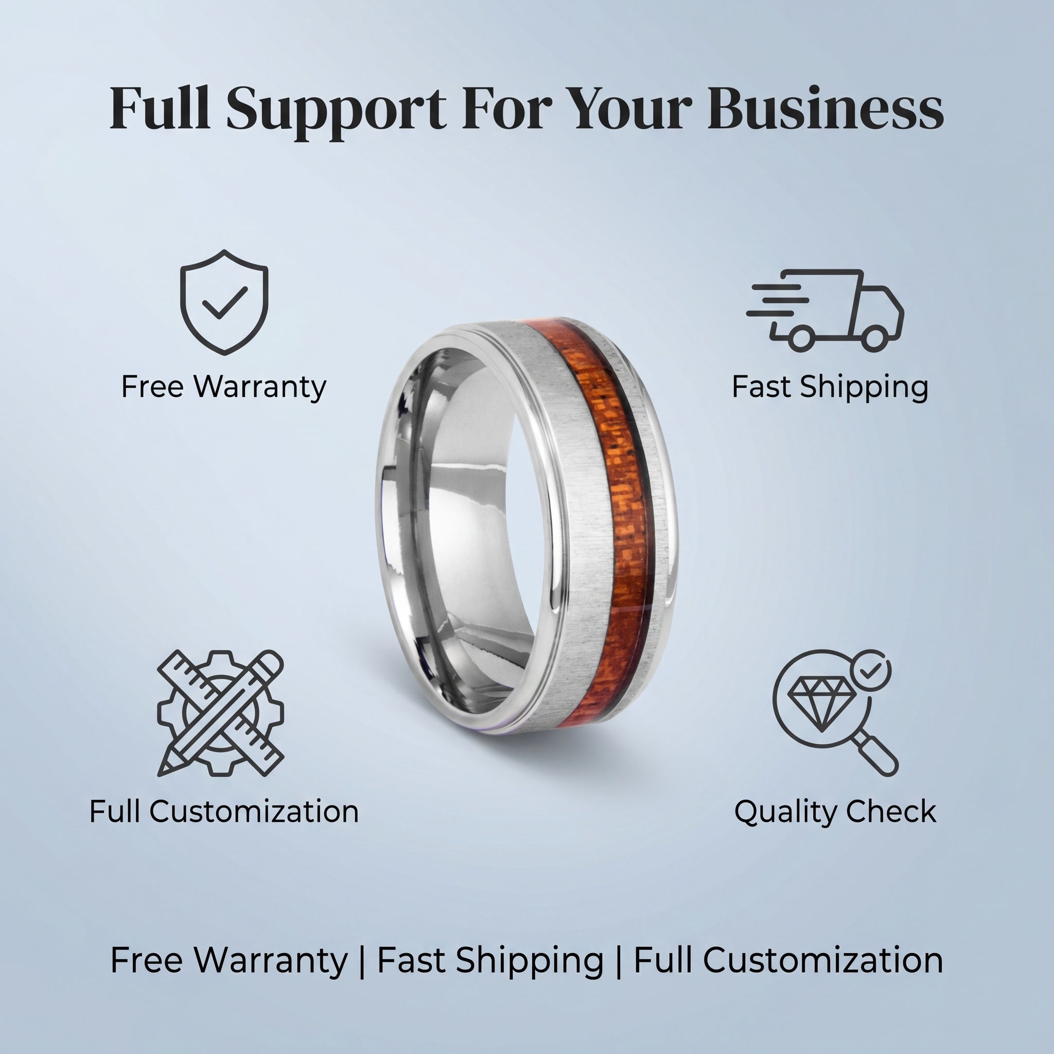 This 8mm stainless steel ring features a natural wood inlay and brushed finish, with waterproof design for daily wear. It is suitable for wedding, engagement and promise occasions, applicable for both men and women. We provide strict quality control and professional after-sales service, supporting wholesale orders and customization needs.